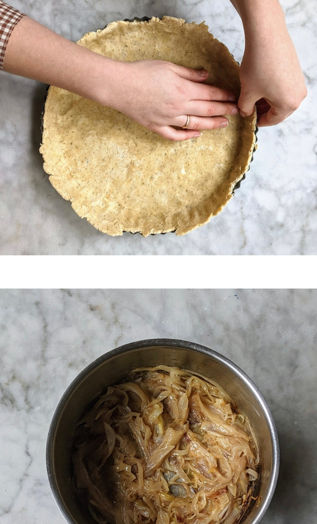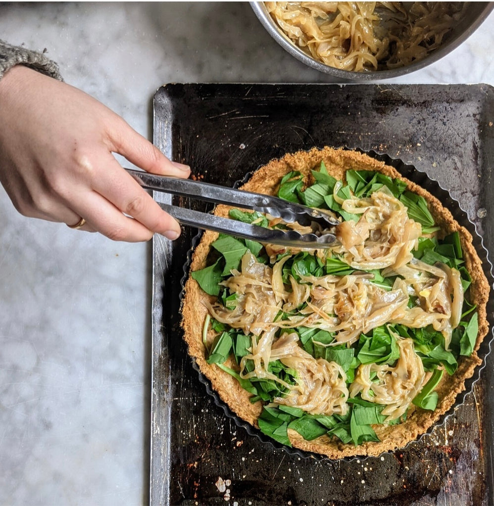 - Place the wild garlic down first in your tart base, followed by the caramelised shallots. Pour in half your milk mix, and scatter over some chervil and more parmesan if you like.