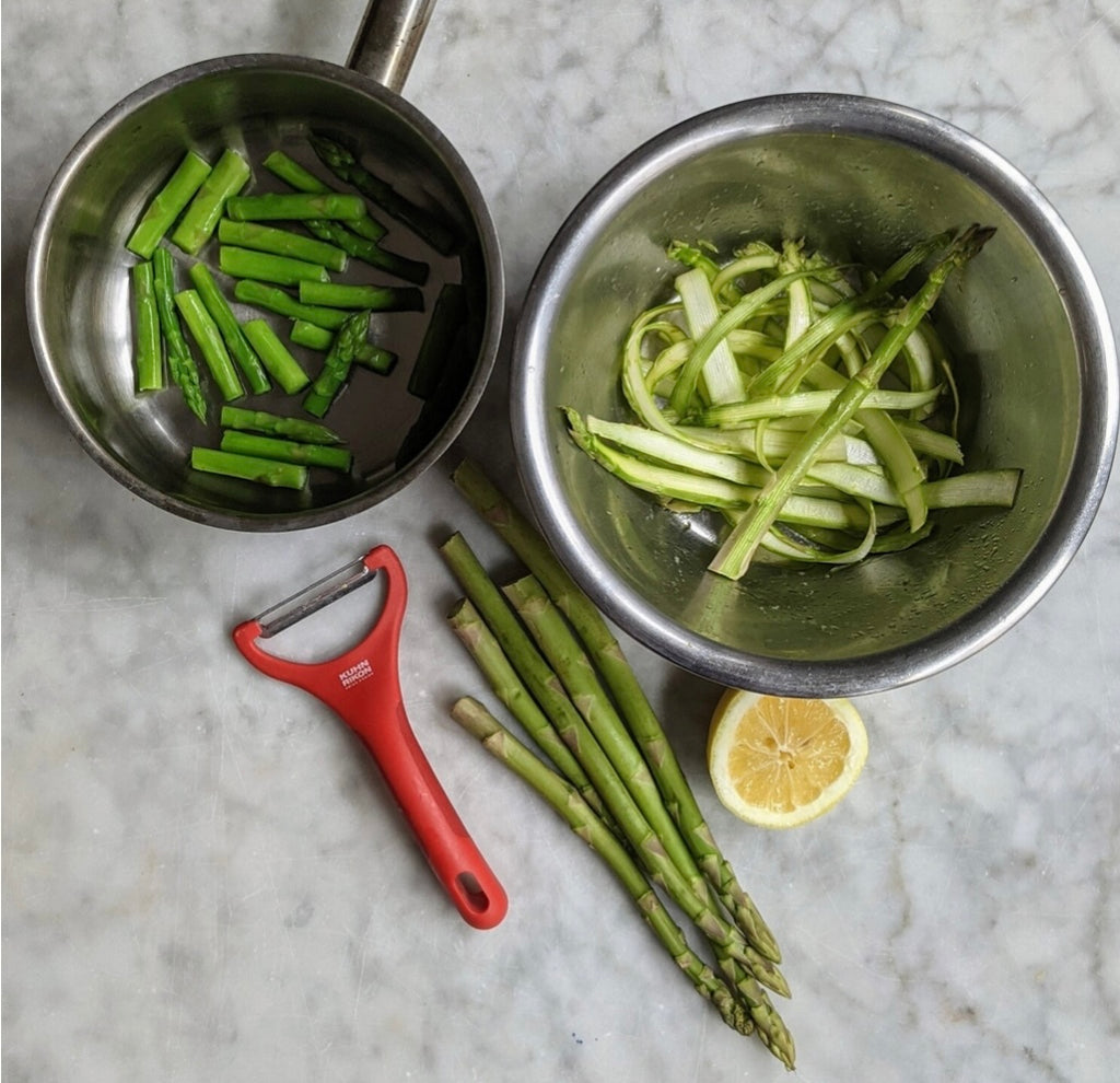 - Take half the spears of asparagus and boil gently for 2-3 mins. Drain then blanch in ice water. Slice into 5cm lengths. Melt some butter and drizzle over.