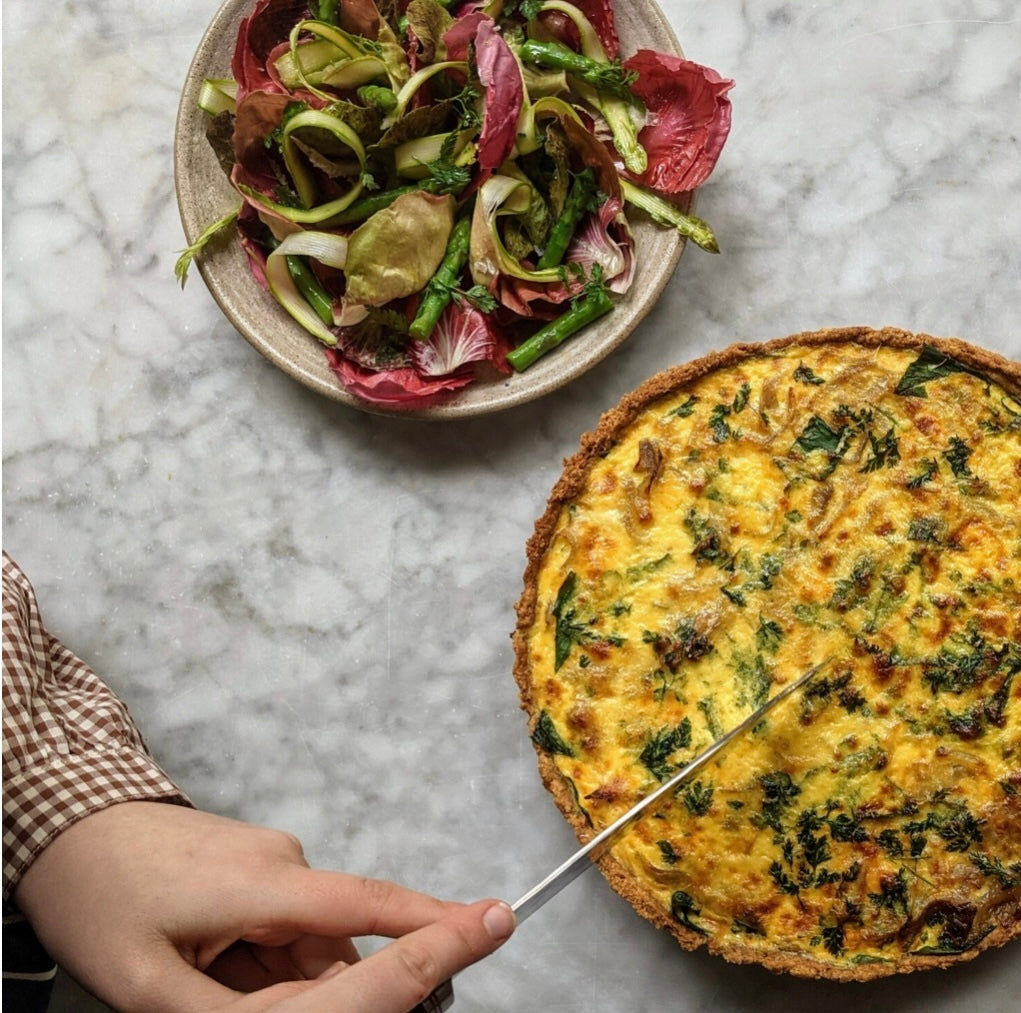'This Caramelised Shallot & Wild Garlic Tart with Asparagus Salad is the perfect recipe for a picnic or garden dinner. Delicious hot or cold, this tart has lots of wild garlic leaves - which are abundant from Feb through till the end of May. Served simply with a beautiful radicchio, parmesan & asparagus salad.'