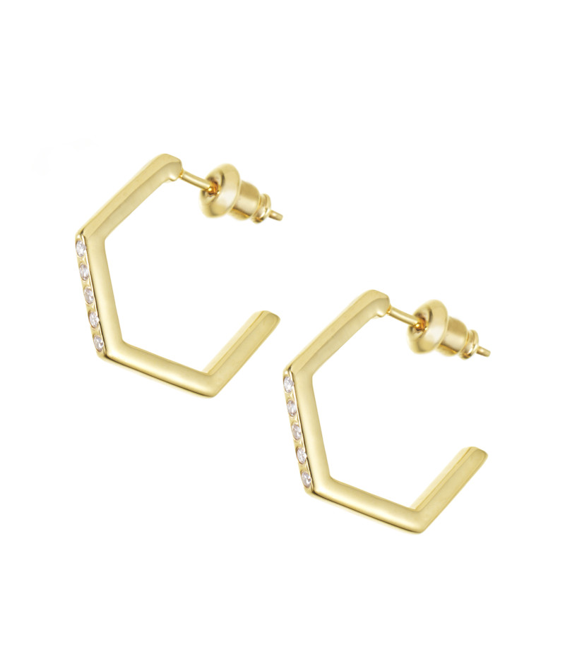 Hexagon shaped hoop earrings with a crystal encrusted bar running down one edge.