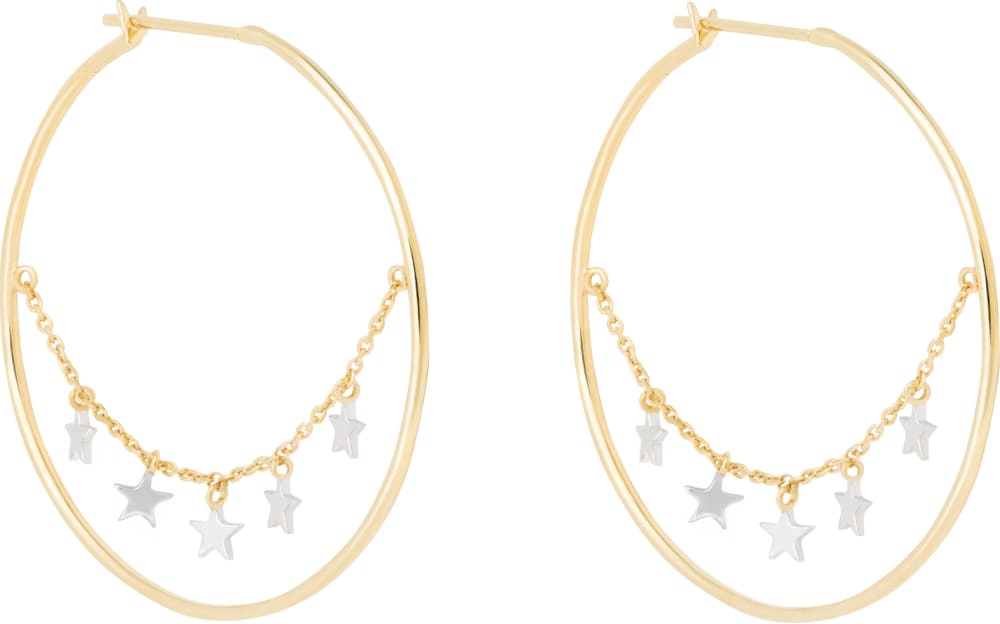 These earrings have wafer thin opposing colour stars dangling from a sparkling chain in the middle of the hoop. Adding the perfect level of detail to your everyday hoops.